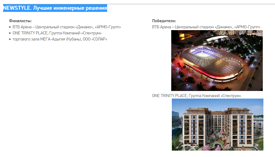 На престижном конкурсе ProEstate Awards 2017 жилой комплекс One Trinity Place признан лучшим в номинации NEWSTYLE. Лучшие инженерные решения